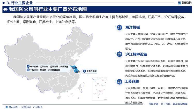 我国防火风闸产业呈现出多元化的竞争格局,国内防火风闸生产商主要有都瑞堡、海洋机械、江苏三先、沪江特种设备、江苏兆胜、常熟海鑫、江苏宏宇、上海外高桥等。其中海洋机械主要从事挡火闸、空调及通风附件、舾装件等的生产和设计。产品已经销往全国各大船厂以及海洋石油平台。船用挡火闸系列拥有CCS、ABS、LR、DNV、KR等船级社证书。沪江特种设备主要产品有:船用冷水机组系列、船用空调系列、船用冷藏系列、特种舱室空调系列、船用专用冷却装置系列、游艇游轮空调系列、船用加热装置及船用通风附件系列。先后为国家各类船舶及海洋工程提供配套产品。江苏兆胜是集研发、制造、销售、服务于一体的特殊空间环境控制系统解决方案专家,产品涉及空调系统、冷藏系统、通风系统、船舶环保系统等,是专业的船用暖通系统集成解决方案提供商。