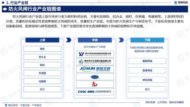 防火风闸行业产业链上游市场参与者为原材料供应商,主要包括钢铁、铝合金、铜材、传感器、电磁阀等。上游原材料的价格、质量和供应稳定性直接影响防火风闸的成本、质量和生产进度。中游为防火风闸生产与制造环节。下游应用领域主要包括船舶领域、能源领域与建筑领域等。下游产业链的需求变化直接影响防火风闸的销售和市场规模。